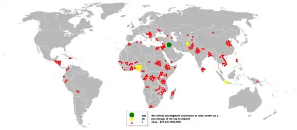 خريطة تبين توزع المساعدات الدولية للدول النامية سنة 2005.