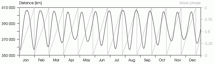 ويمكن أن تتغير المسافة القمرية المقاسة بأكثر من 21000 كم من القيمة المتوسطة طوال شهر نموذجي. هذه الاضطرابات مفهومة جيدا[18] ويمكن تحديد المسافة القمرية بدقة على مدى آلاف السنين.[14]