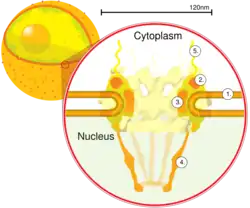![]() Nuclear pore. Side view. 1. Nuclear envelope. 2. Outer ring. 3. Spokes. 4. Basket. 5. Filaments. (Drawing is based on electron microscopy images) Nuclear pore. Side view. 1. Nuclear envelope. 2. Outer ring. 3. Spokes. 4. Basket. 5. Filaments. (Drawing is based on electron microscopy images) | |