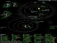 - فوياجر 1، مسبار فضاء تابع لبرنامج فوياجر، زار في مرحلة معينة كوكبي المشتري وزحل، فكان أول مسبار يقدم صورة شاملة عن هذين الكوكبين الضخمين وأقمارهما. ليصبح فيما بعد كأول مركبة من صنع البشر تغادر المجموعة الشمسية، حيث تم تمديد مهمته لتشمل دراسة حدود المجموعة الشمسية وحزام كايبر.