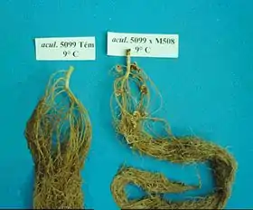 ![]() عقد جذرية على نباتات الفصة الجرارة - لاحظ النبات على يسار الصورة لا يحوي عقداً جذرية نظراً لعدم القيام بتلقيحه بالمستجذرة. | |