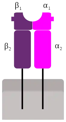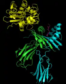 يحتوي هذان المجالان (أعلاه) على مناطق ارتباط مع مركب التوافق النسيجي الرئيسي من النوع الثاني (MHC class II) ومستقبل الخلايا التائية، على التوالي. [6]