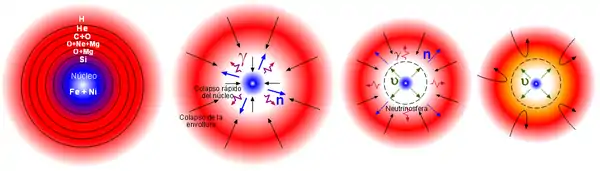 توضح الصور من اليسار إلى اليمين مراحل حياة عمر النجم: بعدما يستهلك النجم وقوده من الهيدروجين والهيليوم بالاندماج النووي الذي ينتج عناصر أثقل، يستمد طاقته من اندماج العناصر الخفيفة مثل الكربون والأوكسجين والسيليكون ويتم تحويلها إلى عنصر الحديد Fe والنيكل Ni. فعندها ينتهي كل ما له من رصيد من الوقود لاستمرار التفاعل النووي.