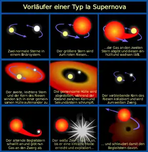قام بتصنيف المستعر الأعظم نوع Ia العالمان الفلكيين رودولف مينكوفسكي وفريتز زفيكي.[7] وتوجد عدة طرق لنشأة هذا النوع من المستعرات العظمى ولكنهم يشتركون جميعا في ميكانيكية نشأتهم (عملية تجميع مادة من نجم مجاور ثم الانفجار عندما تصل كتلة النجم (المنفجر) إلى الكتلة 1.38 من كتلة الشمس). فعندما تكون سرعة دوران النجم حول محوره بطيئة ويجذب إليه غاز من نجم قرين و"يشتعل" فيه اندماج الكربون والأكسجين فإنه لا يستطيع تعدية حد شاندراسيخار[8] ويبدأ في التقلص. وعندما لا يكون هناك تفاعل يقاوم تقلصه فقد يتقلص القزم الأبيض مكونا نجم نيوتروني.[9] وهذا ما يحدث في العادة لقزم أبيض يقوم بإدماج المغنسيوم والأكسجين.[10]