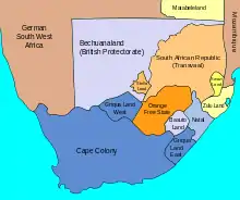 ![]() The Cape of Good Hope c. 1890 with Griqualand East and Griqualand West annexed and Stellaland/Goshen (in light red) claimed | |||||||||||||||||||||||