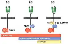 حدد موضع الترابط PI3K المستخدم في المستقبل المشترك CD28، [13] في حين تم تحديد مواضيع تنشيط المستقبلات المناعية القائمة على التيروزين (ITAM) كأهداف لمجموعتي CD4 و CD8-p56lck.[14]