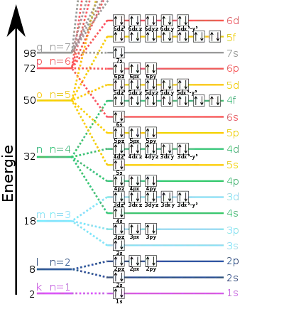 مستوى الطاقة ينشأ من تفاعل القوى الكهرستاتيكية بين الإلكترون وشحنة نواة الذرة الموجبة، ومن الطاقة الناشئة عن العزم الزاوي للإلكترون (حركية، مغناطيسية)