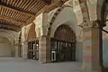 وصدر الرواق الشرقي مغطى ببلاطات من القاشاني الأزرق الجميل؛ ولهذا سمي المسجد بالمسجد الأزرق. وعند حافة الواجهة الغربية، هناك مئذنة أسطوانية في كل دوراتها.