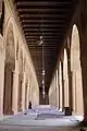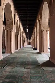بعد تجاوز سور الزيادة وأبواب المسجد يُوصل إلى الإيوانات التي يتوسطها صحن كبير، يمثل الإيوان الشرقي إيوان القبلة وهو أكبر الإيوانات وأكثرها أروقة وزخرفة، حيث يشتمل على خمسة أروقة، فيما تشتمل باقي الإيوانات على رواقين، وبه اللوحة التأسيسية للمسجد التي تتضمن تاريخ إنشاؤه، ويتوسط جداره الشرقي المحراب الرئيسي[معلومة 10]، وهيكله طولوني، أما الفسيفساء والطاقية الخشب ومقرنص القبة أعلاه فهي من أعمال السلطان لاجين، الذي تنضم إلى أعماله أيضاً المنبر الخشبي الذي اتُخذت حشواته من خشب الساج الهندي والأبنوس المدقوق بنقوش مورقة في منتهى الدقة، ونقل لاجين المنبر القديم إلى الجامع الظاهري الذي تلاشى حالياً ولم يبق له أثر. وبالإضافة إلى المحراب الرئيسي بهذا الإيوان توجد خمس محاريب جصية غير مجوفة أخرى استجدت بعد ذلك، اثنان صغيران أحدهما على يمين دكة المبلغ والأخر على يسارها، والمحراب المستنصري الموجود في منتصف البائكة الثانية بالرواق الشرقي من جهة الصحن، وعلى يساره محراب السلطان لاجين، ومحراب يعود إلى عصر المماليك البحرية على يسار المحراب الرئيسي. والأروقة مكونة من دعائم مبنية بالطوب مخلق في نواصيها الأربع عمد وتيجان تحمل عقوداً ستينية حليت حافاتها بزخارف جصية نباتية وفتح فيها شبابيك حليت بزخارف متنوعة، ويعلو العقود إفريز زخرفي من الجص يعلوه إزار خشبي يحيط بأروقة المسجد مكتوب فيه بالخط الكوفي البارز سورتا البقرة وآل عمران. وكان لاختيار الدعائم بدلاً من العمد دليلاً على حسن ذوق المصمم لتماثلها في الطول والسمك وهو ما لا ينطبق على العمد الرخامية التي كانت تختلس عادة من من الكنائس والأديرة المتخربة. استعمل الأسمنت المسلح بالسقوف الأثرية لأول مرة في هذا المسجد، وكان ذلك على يد محمود باشا أحمد مدير إدارة حفظ الآثار العربية فبنى السقف بتقاسيمه القديمة من الأسمنت المسلح ثم غلفه بالأخشاب القديمة والجديدة المطابقة للقديم. ويحيط بجدران المسجد الأربعة من أعلى مائة وتسعة وعشرون شباكاً من الجص المفرغ بأشكال هندسية ونباتية.[8]:ج1ص34:41[9]:ج1ص148[15]:10:13[17]:39