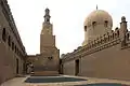 والقبة وسط الصحن هي ثالث قبة أقيمت للمسجد، حيث احترقت القبة الأولى الطولونية للصحن سنة 376هـ/986م، وتهدمت الثانية التي أنشئها العزيز بالله وقيل أمه تغريد سنة 385هـ/995م، وحلت محلها القبة الموجودة حالياً وهي من ضمن أعمال السلطان لاجين بالمسجد وأنشئها سنة 696هـ/1296م، وهي قبة كبيرة يقاس كل من ضلعيها القبلي والبحري 12.75 متر وضلعيها الشرقي والغربي 14.10 متر، وهي محمولة على أربعة عقود كانت شبابيكها محلاة بزخارف وكتابات كوفية، وبرقبتها من الداخل كتبت آية الوضوء، ويتوسطها فسقية، وفي جدارها سلم يوصل إلى سطح قاعدتها المربعة.[8]:ج1ص41:42[9]:ج1ص151 أقيمت المنارة[معلومة 11] على مسافة 0.40 سم من حائط الزيادة الغربية وهي مبنية بالحجر مقاس قاعدتها 12.78 متر × 13.65 متر، وهي مكونة من أربع طبقات الأولى مربعة والثانية مستديرة وهي التي بها السلم الحلزوني والثالثة مثمنة أما الرابعة فتعلوها طاقية تكون معها شكل مبخرة. وهي المنارة الوحيدة في مصر التي لها سلم خارجي يشبه منارة مسجد سامراء. وتاريخ إنشاء المنارة محل خلاف بين الأثريين حيث يرى بعضهم أن السلطان لاجين جددها كاملة سنة 696هـ/1296م على مثالها القديم ضمن أعماله بالمسجد، ويرى البعض الآخر أنها طولونية عدا قمتها التي جددها السلطان لاجين.[8]:ج1ص42[9]:ج1ص151