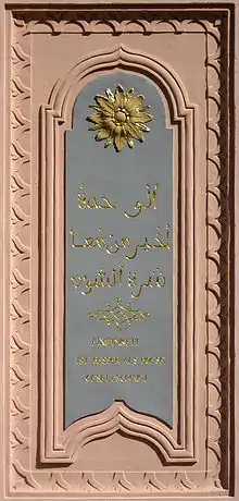 النقوش الموجودة على الواجهة الغربية هي الوحيدة التي لها إشارة واضحة إلى القرآن ولم تتم ترجمتها. ففوق البوابة الرئيسية العبارة الأهم في العقيدة الإسلامية: "لا إله إلا الله"، كما يوجد على اللوحين على يمين الرواق عبارات من القرآن مثل "لم يولد ولم يكن له كفوا أحد". اللوحة العلوية على يسار الرواق عبارة عن سلسلة أدعية قصيرة مثل "سبحانك اللهم وبحمدك تبارك اسمك ولا اله غيرك". اللوحة السفلية عليها:" فسبح بحمد ربك واستغفره انه كان توابا "
