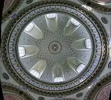 يتكون الجزء الداخلي من المسجد بشكل أساسي من القاعة المقببة التي تتألف من الطابق الأرضي وشرفة علوية وقبة يبدأ منحنى ها من الداخل عند مستوى نوافذ الاسطوانة العليا، ونتيجة لذلك فإن للمسجد قبة داخلية، إذا جاز التعبير، تعلوها قبة خارجية. لذلك لا يمكن رؤية داخل المسجد من النوافذ الستة عشر الموجودة في القبة الخارجية.