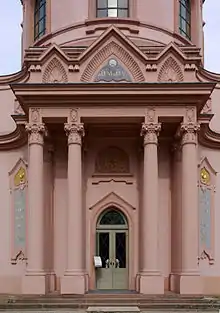 تأثر تصميم الواجهة بواجهة كنيسة كارل في فيينا، ومنها المدخل الغربي إلى المسجد عبر البوابة التي يرتكز جملونها على أربعة أعمدة كاملة وأربعة أعمدة من ثلاثة أرباع مرتبة في أزواج لإظهار المدخل.
