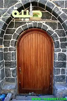 ـ، من رواقين، أولهما مما يلي مدخل المسجد مباشرة، وهو ردهة مكشوفة طولها نحو عشرة أمتار، وعرضها بعرض المسجد وتوجد منارة المسجد بالركن الشمالي الغربي من هذه الردهة.[2] - والقسم الثاني من المسجد، يتكون من بيت الصلاة مربع الشكل طول ضلعه 8م[2]، بُني من الأحجار البازلتية، وطُلي من الداخل بالبياض، ودُهن بالكلس.