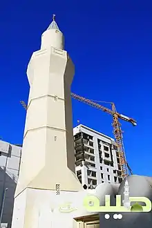 - تقع المئذنة في الركن الشمالي الغربي منه، ويبلغ ارتفاعها مايقارب 15م، وجزؤها السفلي مربع بارتفاع السور، وينتهي بشرفة، بعدها الجزء الثالث وهو أسطواني الشكل ينتهي من الأعلى بهيكل معدني مخروطي الشكل يتوجهُ هلال.[5]