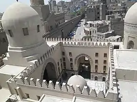 توجد حول صحن المسجد أبواب الخلاوي وهي مكسوة بالرخام الأبيض والأسود، وفي الركن الجنوبي الغربي للإيوان الغربي باب القبة. والواجهة الرئيسية للمسجد هي الشمالية الغربية وتقع القبة في طرفها الغربي، وكذلك المئذنة والمدخل الرئيس، وهو حافل بالمقرنصات والزخارف النباتية.