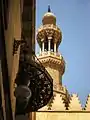 إن مئذنة المسجد حجرية رشيقة على الطراز القاهري المملوكي البديع، ويبلغ ارتفاعها عن سطح الأرض حوالي أربعون متراً، وعن سطح المسجد 24.60 متراً، وتتكون من ثلاث طبقات، الطبقتان الأوليتان مثمنتان، والثالثة تتكون من أعمدة رخامية تحمل مقرنصات لطيفة فوقها خوذة منقوشة. وفي الركن الغربي تقع قبة الدفن.