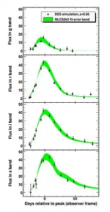 أنشأ عدد من الاستطلاعات الكونية الطموحة للمستعرات العظمى مخطط هابل ذي انزياحٍ نحو الأحمر قريبٍ من العدد 1. بالإضافة لذلك، تُمدد عمليات البحث باستخدام تلسكوب هابل الفضائي هذا المُخطط لتشمل انزياحات نحو الأحمر ذات قيمةٍ أكبر من 1. بناءً على عمليات المسح الأرضية هذه، سوف يواصل مسح الطاقة المظلمة هذا البحث من خلال اكتشاف وإجراء قياساتٍ مفصلة لآلاف المستعرات العُظمى بهدف تحسين الدقة الإحصائية لعلم الكونيات الخاص بها والتحكم في الأخطاء المنهجية في استخدامها لقياس المسافات. سوف يقيس مسح الطاقة المظلمة سطوع 3500 مستعرٍ أعظم تقريباً من النوع الأول Ia. تبعد هذه المستعرات العظمى مسافة مليارات السنين الضوئية عن الأرض. عندما انفجرت المستعر الأعظم الأبعد الذي سيدرسه المسح، كان حجم الكون نصف ما هو عليه الآن. سيرصد مسح الطاقة المظلمة 30 درجة مربعة من السماء عدة مرات، مقسمةً إلى حقلين عميقين وثمانية حقول ضحلة، ما سيؤدي إلى اكتشاف نحو 6000 مُستعرٍ أعظم، أي ثلثي ما سيكون كافياً لقياس المسافات.