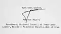 «بصفتى مجاهدًا متواضعًا، وبحكم واجبي الثوري والانضباط التنظيمي، كنت قد استعددت للتضحية بأرخص ما أمتلك وهي حياتي من أجل ثورة هذا الشعب العظيم... ولكن مصالح النظام الديكتاتوري الحاكم خاصة في خارج إيران قد حرمتني في الوقت الحاضر من هذه السعادة الخالدة... ولكن ما يهمني في هذه اللحظات هو أن أجدد العهد مع شهداء الشعب المضرجين بدمائهم والذين - في اللحظات الأخيرة من حياتهم- قبلت شفاههم المحمومة، وسمعت نبضات قلوبهم التي لم تنبض إلا من أجل تحقيق سعادة الشعب وحريته حيث أدينا اليمين جماعيا للصمود حتى النصر».