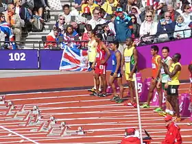 ![]() قبل انطلاق جولة التصفيات (سباق 4) لمنافسات 100 متر للرجال في الألعاب الأولمبية الصيفية 2012 | |