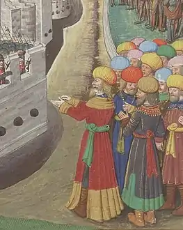 ![]() قسمٌ من منمنمة يظهر فيها مسيح باشا أثناء حصاره قلعة رودس | |