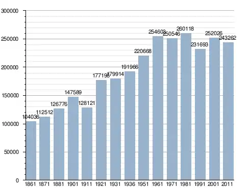 في سنة 1861 بلغ عدد السكان 104٬036 نسمة، وتطور العدد ليصل في سنة 2011 لـ 243٬262 نسمة.