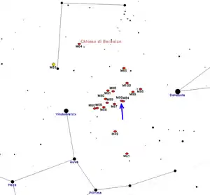 موقع المجرة مسييه 86 بين تجمع مجرات العذراء، ويلاحظ أعلى الشكل بدء تجمع مجرات الهلبة Coma Cluster.