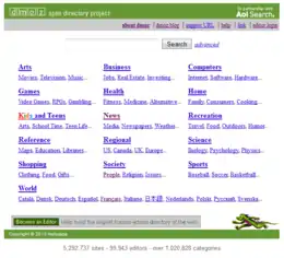 إحتوى على حوالي خمسة ملايين موقع على الإنترنت مؤرشف بطريقة يدوية تعتمد على محررين متطوعين يزيد عددهم عن 90000 محرراً