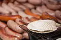 طبخ الاسكالوب على الشواية. النقانق في الخلفية. الطعام في ياتاي في اليابان.