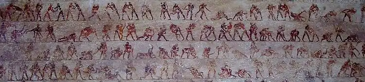 - ظهرت المصارعة في مصر حسب ما هو موثّقٌ على بعض الجدران حوالي 2300 قبل الميلاد فيما تُرجع الأعمال الفنية المصرية تاريخ ظهورها إلى 2000-1085 قبل الميلاد.