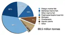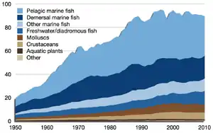 وفقًا لمنظمة الأغذية والزراعة (فاو)، فإن الحصاد العالمي قد تكون بواسطة مصايد الأسماك التجارية في عام 2010 من 88.6 مليون طن من الحيوانات المائية التي تم اصطيادها من المصايد الطبيعية، بالإضافة إلى 0.9 مليون طن أخرى من النباتات المائية وهي (الأعشاب البحرية وغيرها). ويمكن أن تتم مقارنة هذه الأرقام بكمية 59.9 مليون طن التي تم إنتاجها في مزارع الأسماك، بالإضافة إلى 19.0 مليون طن أخرى من النباتات المائية التي تمت زراعتها بواسطة الزراعة المائية.[1]