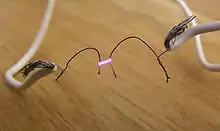 وعند التوصيل بجهد كهربي يحدث توهج بين الإلكترود والبادئ، فيتأين غاز الأرجون سريعا وينتشر حتي يصل للإلكترود الآخر فيسخن الإلكترودين الأصليين وتبعث الإلكترونات ويحدث ما يسمى بالتفريغ الكهربي .
