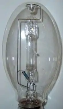 وأنبوب التفريغ الداخلي مصنوع من الكوارتز ( لأنه يتحمل أكثر من 700 درجة مئوية كما يتحمل التغيرات المفاجئة في الحرارة ولا يمتص الضوء المرئي ) , ويوضع بداخة مادتي الزئبق والأرجون , ويوجد بداخلة أيضا إلكترودين أساسين بالإضافة إلى إلكترود بدء يوضع قريب من أحد الإلكترودين الأساسين ومتصل كهربيا بالآخر عن طريق مقاومة بدء . والمجموعة كلها توضع داخل أنبوب زجاج عادي خارجي بينهما غاز خامل.[12]