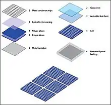 تصنع الألواح الشمسية من طبقات ذات معادن مختلفة، كما هو موضح في الصورة 2، بالترتيب، زجاج، طبقة تغليف، خلايا بلورية، طبقة تغليف، صفيحة خلفية، صندوق الوصل وأخيرا الإطار. يمنع المغلف الرطوبة والأوساخ التي تسبب الأعطال.[9]