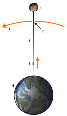 ينظر إليها من المحطة المتزامنة مع الأرض، أي كائن ينخفض قبالة حبل من نقطة أقرب إلى الأرض سوف يتسارع في البداية نحو الانخفاض. إذا أسقطت من أي نقطة فوق المحطة المتزامن مع الأرض، فإن الكائن يتسارع في البداية ثم يرتفع نحو الفضاء