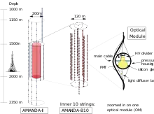 - (AMANDA-B10 (1997: يحتوي على 320 من الغرف الضوئية متصلة ببعضها البعض ب 10 كبلات. كل غرفة على هيئة اسطوانة مقاسها 500 في 120 متر