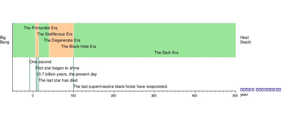 روعي في الرسم البياني تسلسل الأحداث الافتراضية من اليسار (الانفجار العظيم) إلى اليمين بمرور الزمن حتي الموت الحراري Heat death. كما يراعى أن المحور الأفقي الذي يعطي الزمن أنه مقسما تقسيما لوغاريتميا لاعتبار أزمنة طويلة جدا جدا.(ترتيب الأحداث على الرسم البياني هو نفس الترتيب المتبع في المقالة، حيث صعب وضع الأحدات باللغة العربية على الرسم).