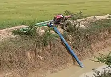 تُستخدم مضخات محورية التدفق ذات قدرة كبيرة جداً في الزراعة ومصائد الأسماك لرفع المياه بغرض الري والصرف. تُستخدم ملايين الوحدات المحمولة ذات القدرات الصغيرة (6-20 حصان) في شرق أسيا، وتُشغل غالباً بمحركات ديزل أوبنزين أحاديةالأسطوانة. تُستخدم هذه المضخات بواسطة صغار المزارعين لري المحاصيل والصرف ومصائد الأسماك. تحسنت تصاميم المروحة الدافعة، وأدى ذلك لرفع كفاءة عملية الزراعة بالإضافة إلى تخفيض التكاليف. كانت التصاميم السابقة ذات أطوال أقل 2 متر، لكنها زادت إلى 6 متر أو أكثر في هذه الأيام مما سمح بوضع مصدر الطاقة (غالباجرار ذو عجلتين) في أماكن أكثر أمناً.