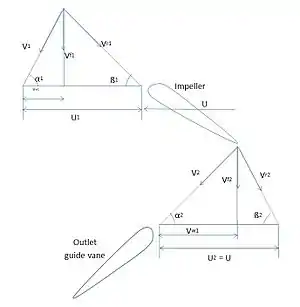 α: الزاوية بين السرعة المطلقة والريشة وتُسمى زاوية التدفق.