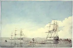 سفينة "أمير ويلز" التابعة لشركة خليج هدسون تقايض البضائع مع الاسكيمو قبالة جزر الهمجي العليا في مضيق هدسون، بواسطة هود روبرت 1819م