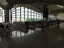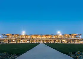 صُمم سقف المبنى المخصص للمسافرين بلون أسود مُستوحى من الخيمة البدوية التقليدية، وعلى شكل وحدات بحيث يسمح لتوسع المطار في المستقبل. كما يعدّ السقف المستوحى تصميمه من الخيم البدوية أحد أبرز ملامح المطار، بقببه الخرسانية المبتكرة التي يصل عددها إلى 127 قبة، وتزن كل واحدة منها 600 طن.[29]