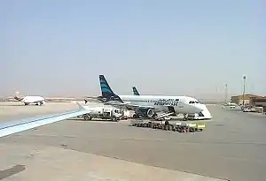 طائرة للخطوط الأفريقية تعبئ حمولتها، فيما تستعد طائرة للخطوط الليبية للإقلاع.
