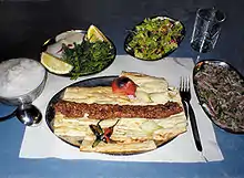 أدانا كباب مع خبز ولبن زبادي وسلطة وبصل أحمر.