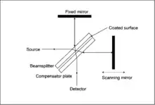 في مقياس ميكلسون تداخل، الضوء من مصدر الأشعة تحت الحمراء متعدد الألوان، أي ما يقرب من مشع الجسم الأسود، يتم موازنته وتوجيهه إلى مقسم الأشعة. من الناحية المثالية ينكسر 50٪ من الضوء باتجاه المرآة الثابتة ويتم نقل 50٪ نحو المرآة المتحركة. ينعكس الضوء من المرآتين إلى حاجز الحزمة وينتقل جزء من الضوء الأصلي إلى حجرة العينة. هناك، يركز الضوء على العينة. عند مغادرة حجرة العينة، يتم إعادة تركيز الضوء على الكاشف. يُعرف الاختلاف في طول المسار البصري بين ذراعي مقياس التداخل باسم فرق التأخر أو المسار البصري (OPD). يتم الحصول على التداخل عن طريق تغيير التخلف وتسجيل الإشارة من الكاشف لقيم مختلفة للتخلف. يعتمد شكل التداخل في حالة عدم وجود عينة على عوامل مثل تباين شدة المصدر وكفاءة الفاصل مع طول الموجة. ينتج عن هذا أقصى تخلف عند الصفر، عندما يكون هناك تداخل بناء في جميع الأطوال الموجية. يتم تحديد موضع التخلف الصفري بدقة من خلال إيجاد نقطة أقصى شدة في التداخل. عند وجود عينة، يتم تعديل التداخل في الخلفية عن طريق وجود نطاقات امتصاص في العينة.