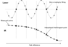 يتم تحويل التداخل إلى طيف بواسطة تحويل فورييه. يتطلب ذلك تخزينها في شكل رقمي كسلسلة من القيم على فترات زمنية متساوية لفرق المسار بين الحزمتين. لقياس فارق المسار، يتم إرسال حزمة الليزر من خلال مقياس التداخل، مما يولد إشارة جيبية حيث يكون الفصل بين الحد الأقصى المتعاقب مساويًا لطول الموجة. يمكن أن يؤدي ذلك إلى تشغيل محول رقمي تمثيلي لقياس إشارة الأشعة تحت الحمراء في كل مرة تمر فيها إشارة الليزر إلى الصفر. بدلاً من ذلك، يمكن قياس إشارات الليزر والأشعة تحت الحمراء بشكل متزامن على فترات أصغر مع إشارة الأشعة تحت الحمراء عند نقاط تقابل تقاطع الصفر لإشارة الليزر والتي يتم تحديدها بواسطة الاستيفاء. [6] يسمح هذا الأسلوب باستخدام محولات تمثيلية إلى رقمية أكثر دقة ودقة من المحولات التي يمكن تشغيلها، مما يؤدي إلى انخفاض مستوى الضجيج.