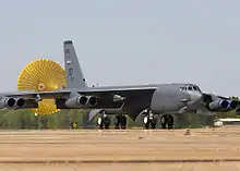 طائرة بي-52 ستراتوفورتريس من جناح القاذفات 307 خلال نشرها مظلة مرساة من أجل الهبوط