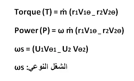 و بالقسمة علي معدل سريان الكتلة ينتج الشغل النوعي للعمود [بالإنجليزية:Specific shaft work] ويتم التعبير عنه بالمعادلة الاتية: