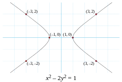 حيث n هو عدد صحيح موجب غير مربع كامل ويتم البحث عن حلول عدد صحيح لx وy. في الإحداثيات الديكارتية، يكون للمعادلة شكل القطع الزائد؛ تحدث الحلول أينما يمر المنحنى عبر نقطة يكون كل من إحداثياها x وy عددًا صحيحًا، مثل الحل البسيط مع x = 1 وy = 0. أثبت جوزيف لويس لاجرانج أنه طالما أن n ليست مربعًا كاملاً، فإن معادلة بيل لها عدد لا نهائي من الحلول الصحيحة المميزة. يمكن استخدام هذه الحلول لتقريب الجذر التربيعي لn بدقة من خلال الأعداد الكسرية للصيغة x/y.