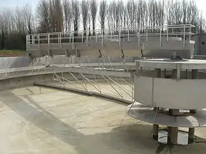 - تزيل المعالجة الثانوية المواد البيولوجية المُذابة والمعلقة. تتم المعالجة الثانوية عادةً بواسطة الكائنات الحية الدقيقة الأصلية التي تنقلها المياه في موائل مُدارة. قد تتطلب المعالجة الثانوية عملية فصل لإزالة الكائنات الحية الدقيقة من المياه المعالجة قبل التصريف أو العلاج المتقدم.