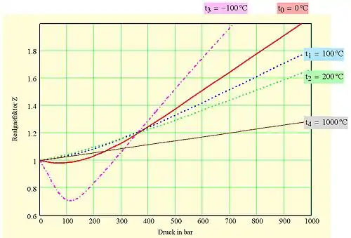 يصعب ضغط الغازات الحقيقية بمقارنتها بالغاز المثالي عند الضغوط العالية حيث يعتبر معامل الانضغاط للغاز المثالي مساويا 1 : كما يمر امعامل انضغاط المغاز الحقيقي عند بدء ارتفاع الضغط بمرحلة نهاية صغرى ويرتفع بعدها مع ارتفاع الضغط .